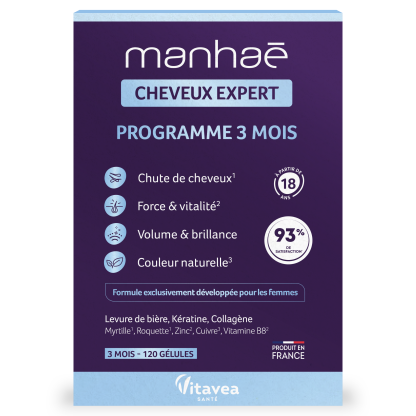 MANHAE CHEVEUX EXPERT est composée de Vitamine B8, de Zinc, de Cuivre, de Collagène, de Levure de bière de Myrtille et de Roquette. La myrtille permet d’activer la micro-circulation du cuir chevelu, la roquette quant à elle participe à la stimulation du bulbe pileux qui favorise la croissance des cheveux et enfin le zinc et la vitamine B8 contribuent au maintien de cheveux normaux.
