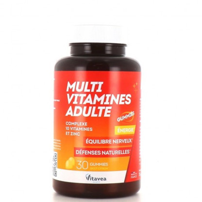 Multi Vitamines Adultes VITAVEA SANTE des laboratoires NUTRISANTE conditionné sous forme de gummies, est composé de Vitamines D, E, C, B1, B2, B3, B5, B6, B8, B9, B12 et de Zinc. Les vitamines B1, B2, B3, B6, B8, B12 contribuent au fonctionnement normal du système nerveux. Les vitamines B6, B9, B12, C ainsi que le zinc aident au fonctionnement normal des défenses naturelles. La formule est complétée par les vitamines C, B2, B3, B5, B6, B9, B12 qui contribuent à maintenir l’énergie de l’organisme.
