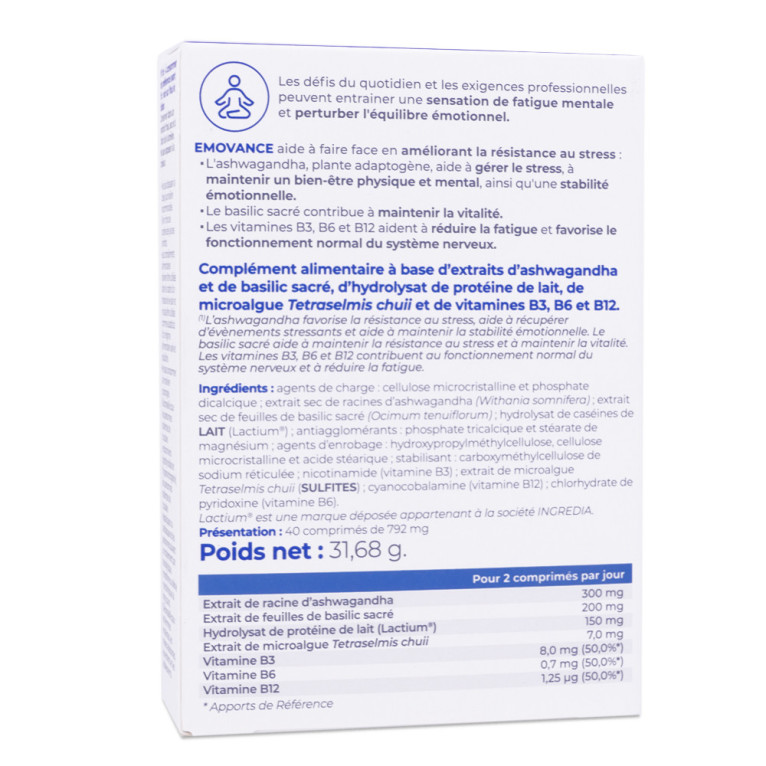 agents de charge : cellulose microcristalline et phosphate dicalcique; extrait sec de racines d'ashwagandha (Withania somnifera); extrait sec de feuilles de basilic sacré (Ocimum tenuiflorum); hydrolysat de caséines de LAIT (Lactium®);Antiagglomérants: phosphate tricalcique et stéarate de magnésium; agents d'enrobage : hydroxypropy|méthylcellulose, cellulose microcristalline et acide stéarique; stabilisant : carboxyméthylcellulose de sodium réticulée; nicotinamide (vitamine B3); extrait de microalgue Tetraselmis chui (SULFITES); cyanocobalamine (vitamine B12) ; chlorhydrate de pyridoxine (vitamine B6).