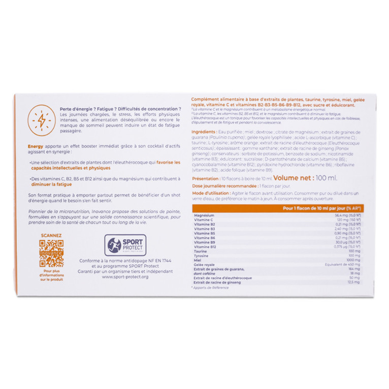 Ingrédients : Eau purifiée ; miel ; dextrose ; citrate de magnésium ; extrait de graines de guarana (Paullinia cupana) ; gelée royale lyophilisée ; acide L-ascorbique (vitamine C) ; taurine ; L-tyrosine ; arôme orange ; extrait de racine d’éleuthérocoque (Eleutherocoque senticosus) ; épaississant : gomme xanthane ; extrait de racine de ginseng (Panax ginseng) ; conservateurs : sorbate de potassium, benzoate de sodium ; nicotinamide (vitamine B3) ; édulcorant : sucralose ; D-pantothénate de calcium (vitamine B5) ; cyanocobalamine (vitamine B12) ; pyridoxine hydrochloride (vitamine B6) ; riboflavine (vitamine B2) ; acide folique (vitamine B9).