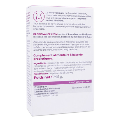 Il contient des ingrédients soigneusement sélectionnés, tels que des probiotiques, qui contribuent au bon fonctionnement de la flore intestinale et participent à l'équilibre du microbiote. La flore vaginale, également connue sous le nom de flore de Döderlein, est principalement constituée de lactobacilles et exerce une fonction protectrice pour la santé intime des femmes. Au cours de la vie d'une femme, divers éléments internes ou externes peuvent perturber cet équilibre. PROBIOVANCE ITIM renferme trois souches spécifiques de lactobacilles probiotiques, avec un dosage de 15 milliards d'U.F.C.* (Unités Formant Colonie).