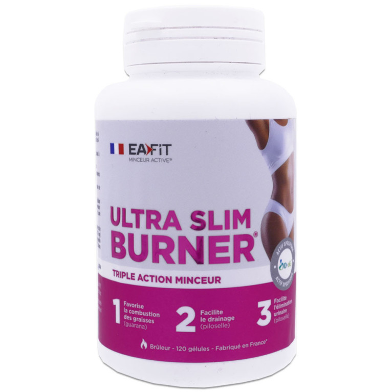 Ultra Slim Burner Quadruple Action Minceur d’EAFIT Minceur Active, est un complément alimentaire à base de thé vert, qui aide à brûler les graisses, et de piloselle qui facilite les fonctions d’élimination de l’organisme et aide à réduire les toxines du corps. L’algue brune vient s’ajouter à ce produit et contribue à l’élimination des graisses.
