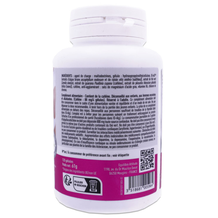 INGRÉDIENTS : agent de charge : maltodextrines, ID-alG™ (extraits d’algue brune et de raisin), extrait de thé vert (maltodexrines), extrait de guarana (maltodextrines), extrait de piloselle (maltodextrines, silice), caféine, anti-agglomérant : stéarate de magnésium, vitamine B6, minéral : chlorure de chrome. Gélule : gélatine marine, colorant : dioxyde de titane (E 171).