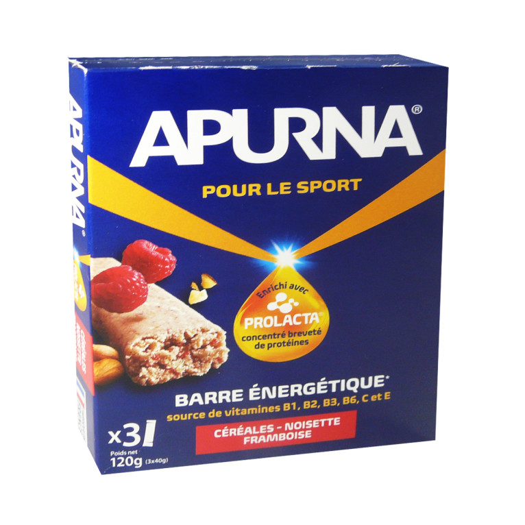 Barre énergétique d’APURNA Pour le sport à prix discount, une barre énergétique savoureuse aux céréales dans votre parapharmacie en ligne, qui apporte glucides, vitamines et minéraux pendant l’effort pour éviter les coups de fatigue. Saveur noisette framboise