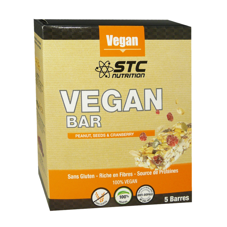 La gamme VEGAN ET GOURMAND de STC NUTRITION, composée de produits à base de protéines 100% végétales et d’ingrédients naturels s’adresse aux personnes végétariennes ou pour celles qui souhaitent des ingrédients 100% naturels. Les barres gourmandes VEGAN Bar peuvent être consommées comme en-cas pendant la journée ou pendant un effort. Ce complément alimentaire sous forme de barre hyperprotéiné riche en fibres, est composé de protéines végétales, acides gras insaturés vitamines et minéraux ainsi que de cacahuètes, graines de tournesol et courge (riche en antioxydants et protéines), de cranberries (super fruit appelé aussi canneberge) et raisins secs. Grâce à ses nutriments et par sa faible teneur en sucres et matières grasse et sa forte teneur en protéines (5,4g par barre), il va participer au métabolisme énergétique, redonner de l’énergie lors de petite fatigue ou dans le cadre d’une activité sportive, tout en gardant de la vitalité. Les barres au délicieux goût cacahuètes raisins secs et cranberries sera un régal à consommer. Rapidement, le tonus revient. Les barres gourmandes VEGAN Bar peuvent être consommées au en en-cas, pendant une activité physique, ou pendant la journée. Sans gluten