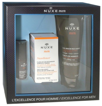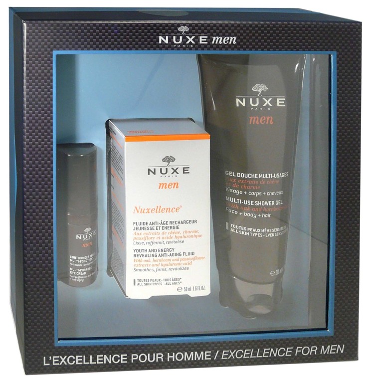 Le Coffret « L’excellence pour homme » de NUXE contient 3 produits à la fragrance masculine NUXE aux pouvoirs anti-âge et anti-fatigue pour prendre soin de sa peau : Nuxellence fluide anti-âge (50ml) ; Contour des yeux multifonctions (15ml) ; Gel douche multi-usage (100ml).