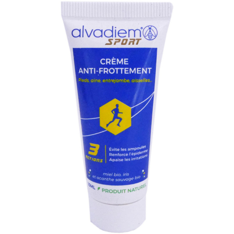 Reconnu pour son expertise dans le domaine de la podologie, alvadiem couvre 100% des besoins du pied et a su au fil d’échanges et de rencontres, étendre sa gamme à l’ensemble des zones du corps. Toujours portés par des origines apicoles, le laboratoire Alvadiem propose plus de 17 produits avec au cœur de chacun, un actif de la ruche minutieusement sélectionné pour ses bienfaits pour la peau. Des formules saines et respectueuses des abeilles qui conjuguent sans concession, efficacité, sensorialité et naturalité. La crème anti-frottement Alvadiem agit par 3 actions : Evite les ampoules ; Renforce l'épiderme et Apaise les irritations. Ses composants contribuent à exercer ses actions : le miel d'acacia, grâce à sa teneur en sucres, maintient l'eau à la surface de la peau et offre une hydratation continue et évite ainsi le frottement, l'acanthe sauvage, petite fleur des champs, riche en flavonoïdes va booster la régénération cellulaire afin que la peau se reconstitue tout en apaisant les irritations et la fougère tropicale, riche en phytostérols, qui va favoriser le lien épiderme-derme et augmenter la résistance de la peau.
