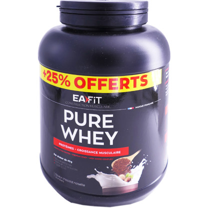 Pure Whey Croissance Musculaire d'EAFIT, une préparation pauvre en sucres spécialement formulée pour répondre spécifiquement à tous les sportifs recherchant la croissance musculaire, dans votre parapharmacie en ligne à prix discount. Saveur Chocolat-noisette