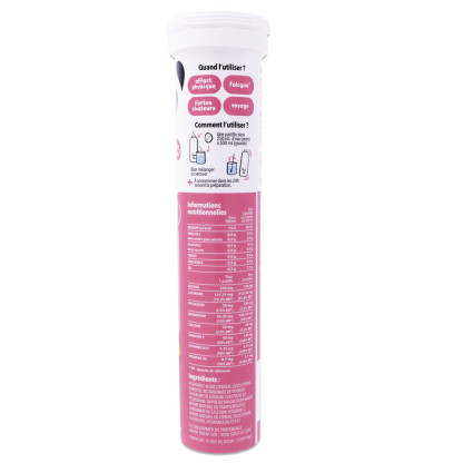 Ingrédients : Acidifiant : acide citrique ; édulcorant : sorbitol ; bicarbonate de sodium ; chlorure de sodium ; chlorure de potassium ; oxyde de magnésium marin ; carbonate de calcium ; vitamine C ; arôme naturel de citron ; arôme naturel ; édulcorant : sucralose ; vitamines B6 et B12