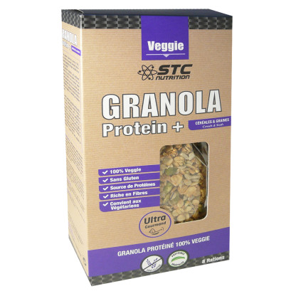 La gamme VEGAN ET GOURMAND de STC NUTRITION est destinée aux personnes végétariennes ou souhaitant consommer des produits 100% naturels aux protéines végétales et sans additifs, pour se faire plaisir tout en gardant son équilibre. GRANOLA PROTEIN+ est un mélange de céréales et légumineuses avec graines de tournesol, courge et lin et accompagné de miel riches en protéines 100% végétales et d’acides aminés essentiels équilibré. Consommer au petit-déjeuner ou en en-cas, GRANOLA PROTEIN+ apportera de l’énergie pour éviter les « coups de pompe » dans la journée tout en gourmandise ! Sans soja - Sans lactose – Sans gluten