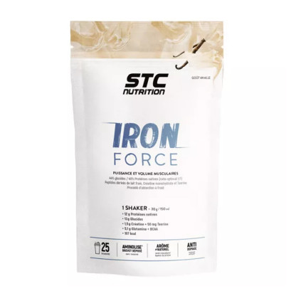 Protein IRON FORCE de STC NUTRITION, le complément spécifique qui apporte protéines, et vitamines pour renforcer, accroître et améliorer la masse musculaire et les performances, lors d’exercices physiques très intenses et répétés. Arôme Vanille