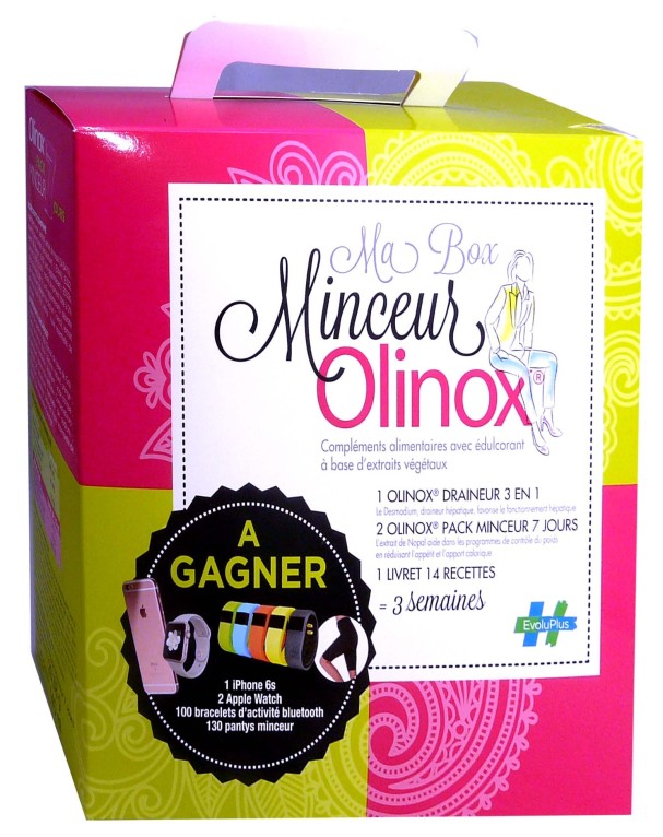 « Ma box minceur » Olinox d’EVOLUPHARM, un programme sur 3 semaines pour perdre du poids et retrouver une belle ligne pour l’été ! Olinox Draineur 3 en 1, et Olinox Pack Minceur 7 jours + livre « 14 recettes ».