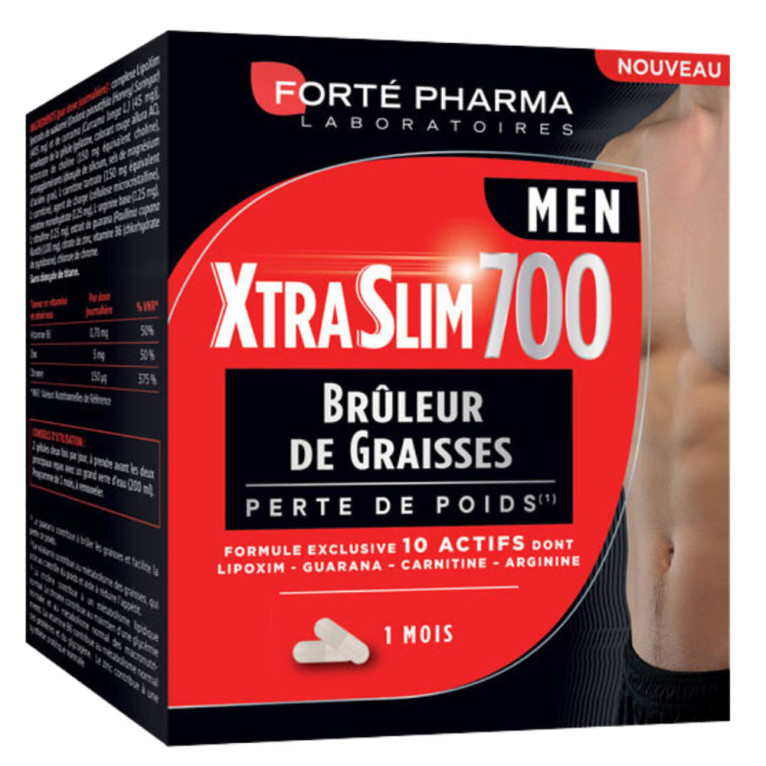 XtraSlim 700 Men de FORTÉ PHARMA est un complément alimentaire conditionné sous forme de gélules spécialement formulé pour contribuer à la perte de poids. La formule innovante de XtraSlim 700 Men associe du « LipoXim » à base de 3 extraits de plantes (curcuma, wakamé, guarana) à 4 nutriments qui vont agir sur le métabolisme de l'organisme (choline, vitamines B6, zinc, chrome). Le wakamé contribue au métabolisme des graisses, aide au contrôle du poids et aide à réduire l’appétit. Le guarana aide à combattre les excès de poids et facilite l'amincissement dans le cadre d'un régime minceur. La choline contribue à un métabolisme lipidique normal. Le chrome contribue au maintien d'une glycémie normale et au métabolisme normal des macronutriments. La vitamine B6 contribue au métabolisme normal des protéines et du glycogène et réduit la fatigue et le zinc contribue au métabolisme normal des glucides. XtraSlim 700 Men contient également 2 acides aminés et 1 dérive d’acide aminé (créatine, citrulline, arginine) pour participer au séchage musculaire.