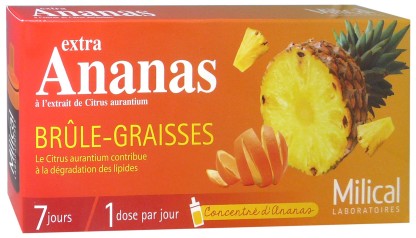 Extra Ananas Brûle-graisses de Milical est un complément alimentaire en flacon. Sa composition associe du citrus aurantium qui active la dégradation des lipide et du jus concentré d’ananas qui est extrait du fruit tropical. Dans cette formule le citrus aurantium favorise la dégradation des lipides.