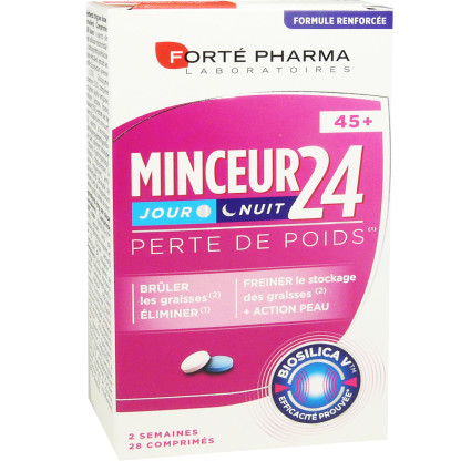 MINCEUR 24 Jour Nuit 45+ de FORTÉ PHARMA est un complément alimentaire conditionné sous forme de deux types de comprimés à prendre le matin et le soir, spécialement formulé pour contribuer à la perte de poids et assurer une action minceur globale de jour comme de nuit chez les femmes après 45 ans.