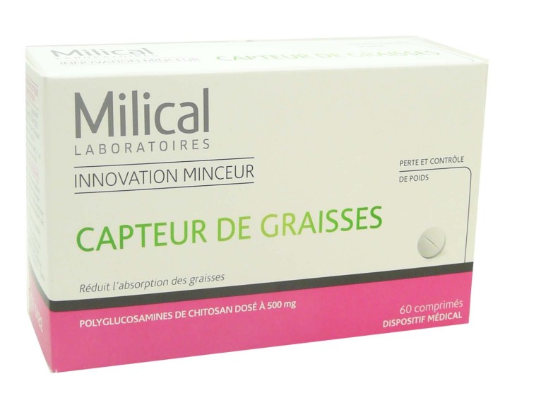 Depuis plus de 40 ans, MILICAL développe des produits conçus pour favoriser le contrôle de l’apport calorique, la perte de poids et accompagner avec succès toutes les personnes qui s’engagent dans une démarche minceur. Les gammes compléments alimentaires proposent des solutions ciblées pour accompagner efficacement les régimes. Capteur de graisses de Milical est un complément alimentaire sous forme de comprimé, spécialement conçu pour favoriser la perte de poids en limitant l’assimilation des lipides et en neutralisant leur apport calorique. Capteur de graisse est composé de polyglucosamines de chitosan, une fibre naturelle capable de se lier aux graisses et de les absorber jusqu’à 5 fois leurs poids, de stimuler la motilité intestinale favorisant ainsi le glissement du bol alimentaire. Capteur de graisses de Milical est l’allié indispensable de toutes les démarches minceur.