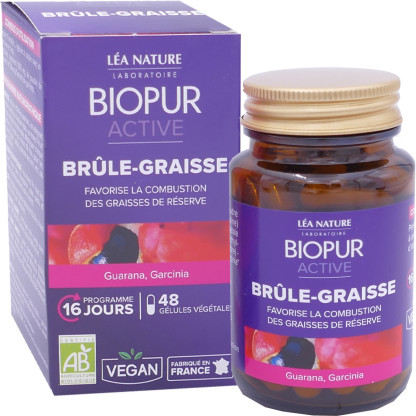 BIOPUR est une marque du laboratoire LEA NATURE composée de compléments alimentaires, super-aliments, thés et infusions fabriqués en France, à base d’actifs naturels et biologiques labellisé AB et vegan. BIOPUR Brûle-graisses est un complément alimentaire Vegan fabriqué en France sous forme de gélules végétales. Il est composé de graine de guarana qui contribue au contrôle du poids et au métabolisme des graisses et de fruit du garcinia qui participe à réduire le stockage des graisses et réduit la sensation d'appétit.