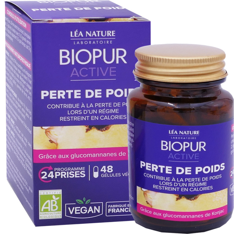 BIOPUR est une marque du laboratoire LEA NATURE composée de compléments alimentaires, super-aliments, thés et infusions fabriqués en France, à base d’actifs naturels et biologiques labellisé AB et vegan. BIOPUR Perte de Poids est un complément alimentaire sous forme de gélules végétales à base de tubercule de konjac. Le Konjac riche en glucomannane au pouvoir gonflant dans l’estomac va augmenter l’effet de satiété et permettre de modérer l’appétit. Il va former un gel épais et inassimilable en couvrant une partie de l’estomac et ainsi produire un effet de satiété. Associé à un contrôle de l’apport calorique lors d’un régime hypocalorique, BIOPUR Perte de Poids est l’allié de toute démarche minceur.