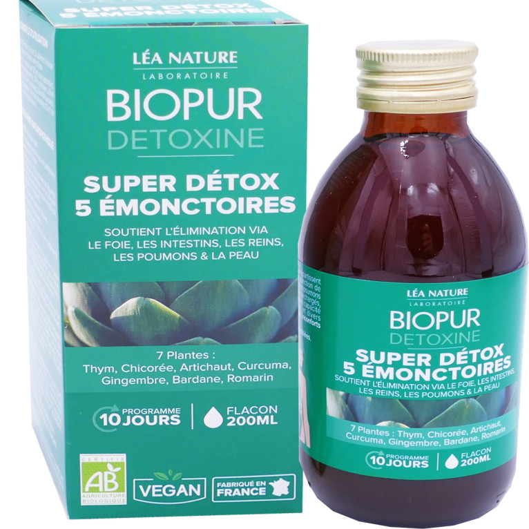BIOPUR Super Détox 5 Émonctoires discount des laboratoires LEA NATURE, un complément alimentaire bio liquide aux extraits naturels dans votre parapharmacie en ligne à prix discount.