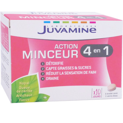 JUVAMINE Action minceur 4 en 1 du laboratoire JUVAMINE est conditionné sous forme de comprimés à base de Nopal qui contribue à limiter l’absorption des graisses et des sucres ainsi qu'à réduire l’appétit. La formule est complétée par le Fucus qui participe à la perte de poids et aide à augmenter la sensation de satiété. De l’artichaut y est ajouté et participe à l’élimination des toxines de l’organisme. Ce complément alimentaire à base de plantes est à prendre sur 10 jours.
