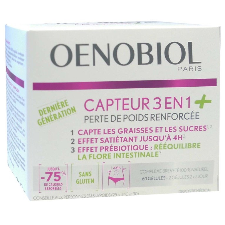 Ce dispositif médical doit être utilisé dans le cadre d'un mode de vie sain et ne pas être donné comme substitut d'un régime alimentaire varié et équilibré. Réservé à l'adulte. Ne pas mâcher ou mordre les gélules, ni les laisser se dissoudre dans la bouche. Ne pas dépasser la dose journalière recommandée.Ce dispositif médical pouvant influer sur la glycémie, il est recommandé aux personnes diabétiques de consulter leur médecin avant tout traitement.En cas de traitement en cours, demandez l'avis de votre médecin ou de votre pharmacien avant de commencer la prise de ce dispositif. Il est recommandé d'espacer la prise d'Oenobiol® Capteur 3 en 1 de celle d'autres médicaments (par exemple contraceptifs), vitamines ou acides gras essentiels ; respectez un intervalle d'au moins quatre heures entre la prise des deux produits.Conserver hors de portée des enfants. À stocker dans un endroit sec à température ambiante et à labri de la lumière Ne pas utiliser en cas d'allergie ou d'intolérance à l'un des composants. Ne pas utiliser en cas de déficit pondéral (IMC<18,5). Ne pas donner aux femmes enceintes ou qui allaitent, sans avis médical.