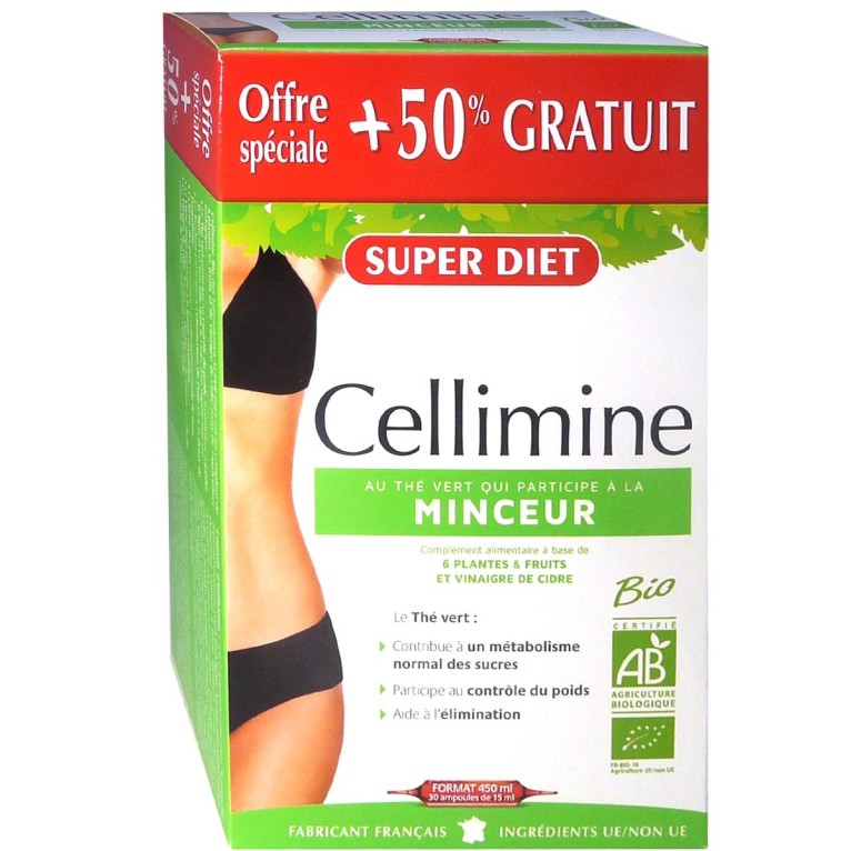 Cellimine Bio de SUPER DIET est un complément alimentaire conditionné sous forme de d'ampoules à base de de thé vert pour favoriser le processus d’élimination de l’organisme, de vigne rouge Bio pour favoriser une bonne circulation sanguine, aux extraits de bouleau et de reine des près Bio pour brûler les graisses de réserve, Le vinaigre de cèdre complète la formule. Jour après jour la taille s'affine, la peau est plus ferme et la perte de poids visible.