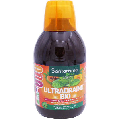 Ultradraine bio de SANTAROME est un complément alimentaire sous forme de boisson à diluer à l’ananas, composé de 10 plantes et 3 bourgeons bio : du thé vert, pissenlit, reine des près Frêne, Nopal, Papaye, et fibres d'acacia, Cassis et Romarin. Dans cette formule le pissenlit aide à soutenir la désintoxication de l'organisme en stimulant la diurèse. La reine des prés et le frêne quant à eux sont traditionnellement utilisés pour faciliter les fonctions d'élimination de l'organisme. Enfin la formule est complétée par du thé vert qui contribue à brûler les graisses ainsi qu'à contrôler le métabolisme des graisses et facilite la perte de poids en complément de mesures diététiques.