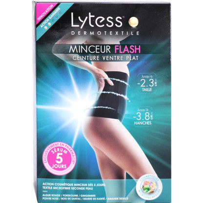 La marque LYTESS conçoit des vêtements cosmétotextiles aux propriétés amincissantes à base d'actifs naturels pour répondre aux besoins des femmes. La Ceinture ventre plat composée d’un textile en microfibre ultra doux comme un effet seconde peau, contient des actifs micro encapsulés qui en se libérant au contact de la peau par frottements vont participer à l’amincissement en diminuant le tour de taille. Ces micro capsules contiennent de l’algue rouge, de la forskoline, des extraits de gingembre, poivre rose, bois de santal, du beurre de karité et de l’huile d’amande douce. Ces actifs naturels vont avoir des propriétés drainantes, nourrissantes et amincissantes. Très résistante, la ceinture gainante, ultra-douce et légère se porte en toute discrétion sous des vêtements et ne glisse pas grâce à ses bandes antiglisse au niveau de la taille. En 5 jours, la silhouette s’affine, la taille perd des centimètres.