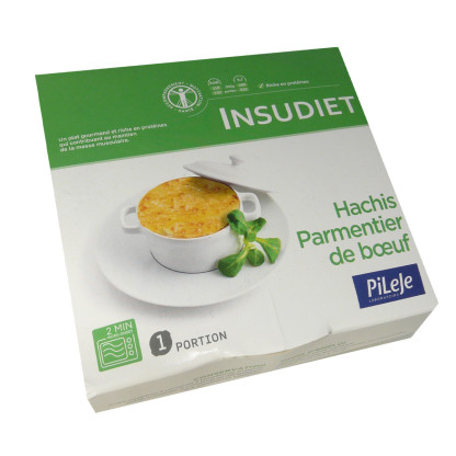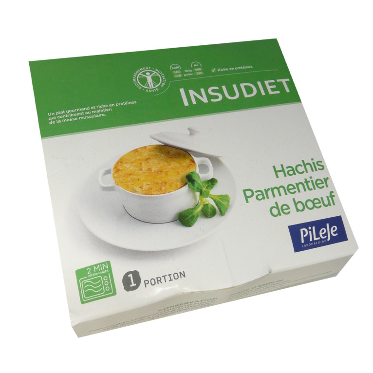 Les produits INSUDIET des laboratoires PILEJE sont élaborés en collaboration avec des professionnels de santé, à base de protéines et nutriments essentiels pour retrouver un bon équilibre alimentaire. Le Hachis Parmentier INSUDIET au bœuf oignons et flocons de pomme de terre, prêt en 3 minutes, est un plat complet hyperprotéiné hypocalorique rapide et facile à préparer, pour retrouver un bon équilibre alimentaire dans le cadre d’un régime alimentaire, et préserver sa masse musculaire. Ce plat qui se substitue à un repas, est riche protéines, pauvre en matières grasses et en sucres, afin de faire un régime minceur en douceur tout en préservant sa santé.