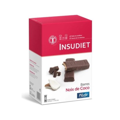 Les Barres INSUDIET Noix de coco des laboratoires PILEJE pas cher, des barres savoureuses et moelleuses, riches en protéines dans votre parapharmacie en ligne pas cher, pour retrouver de bonnes habitudes alimentaires.