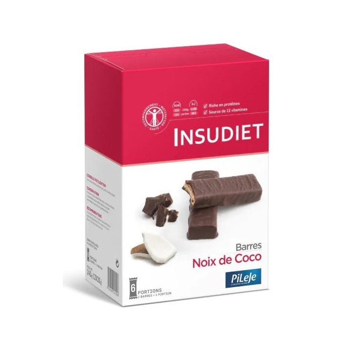 Les produits INSUDIET des laboratoires PILEJE sont élaborés en collaboration avec des professionnels de santé, à base de protéines et nutriments essentiels pour retrouver un bon équilibre alimentaire. Les Barres INSUDIET à la noix de coco, sont un en-cas hyperprotéinée hypocalorique, avec sucres et édulcorants, pour retrouver un bon équilibre alimentaire dans le cadre d’un régime alimentaire. Ces barres moelleuses au délicieux goût de noix de coco qui se substitue à un repas, sont riche en 12 vitamines et protéines, pauvre en matières grasses et en sucres, afin de faire un régime minceur en douceur tout en préservant sa santé.