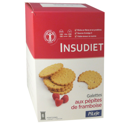 Les produits INSUDIET des laboratoires PILEJE sont élaborés en collaboration avec des professionnels de santé, à base de protéines et nutriments essentiels pour retrouver un bon équilibre alimentaire. Les Galettes INSUDIET aux Pépites de framboise, sont un en-cas hyperprotéiné hypocalorique, avec édulcorants, pour retrouver un bon équilibre alimentaire dans le cadre d’un régime alimentaire. Ces galettes craquantes au délicieux goût de framboise avec pépites de framboise qui se substitue à un repas, sont riche en fibres et protéines source d’oméga 3, pauvre en matières grasses et en sucres, afin de faire un régime minceur en douceur tout en préservant sa santé.