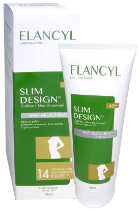 La gamme des Soins minceur du laboratoire ELANCYL est composée de soins pour combattre la cellulite et redessiner la silhouette. L’huile minceur 2 en 1 Slim Design est une innovation ELANCYL. Slim Design 45+ Anti-relâchement va agir sur le déstockage, la fermeté et l’affinement de la silhouette. Elle agit en déstockant les cellules graisseuses et en luttant contre la formation de nouvelles graisses et l’apparition de cellulite, raffermit et redensifie pour redonner de l’élasticité en stimulant la synthèse des fibres de collagène et d’élastine, grâce au complexe de Caféine et aux extraits de lierre, marc de pomme associé à la xanthoxyline et phloridzine. Sa texture onctueuse permet d’adoucir la peau et de s’habiller rapidement après l’application. En 14 jours la peau est raffermir et la silhouette redessinée. En 28 jours la cellulite a visiblement diminué et les capitons sont lissés. Testé cliniquement et sous contrôle dermatologique
