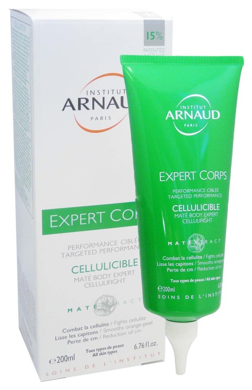 La gamme Expert corps des Instituts Arnaud est composée de soins performants et doux destiné à prendre soin de la peau et affiner la silhouette. Cellulicible Expert Corps est un soin qui diminue les graisses stockées en boostant le déstockage, diminue la cellulite installée, protège la peau des radicaux libres et des signes de l’âge, tonifie et amincit grâce à la haute concentration du complexe exclusif Matéine (maté + caféine), ainsi qu’à ll’actif breveté Unislim (café vert). Sa texture gel qui s’applique facilement se « casse » par le massage pour laisser la peau intensément fraîche et délicatement parfumée. Dès l’application, la peau est lisse et tonique. En quelques semaines, les résultats sont visibles : le tour de taille, de ventre, de fesses et de cuisses a diminué, la cellulite a diminué, la peau est raffermie, la peau d’orange lissée.