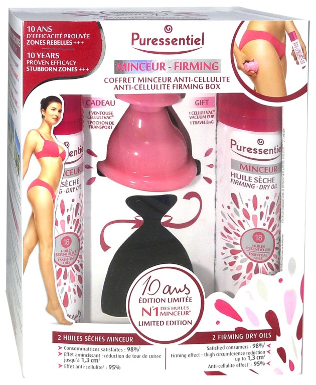 PURESSENTIEL MINCEUR Coffret minceur anti-cellulite, le pouvoir des huiles essentielles pour retrouver une silhouette ferme et affinée dans un coffret en édition limitée. Contient 2 huiles sèches et 1 ventouse Celluli VAC® avec son pochon de transport.