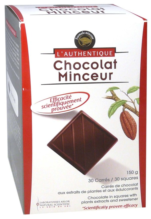 La gamme Minceur des laboratoires ARLOR proposent des compléments alimentaires, boissons et aliments à base d’actifs naturels pour le bien-être et retrouver un poids idéal tout en se faisant plaisir. Ces carrés de chocolat avec 90% de chocolat noir, contient une formule nommée DM 26 composée de Guarana qui est une plante d’Amazonie riche en caféine, de thé vert riche en polyphénols et d'artichaut qui est une plante vivace d’origine du bassin méditerranéen riche en stérols, magnésium, potassium…, et de l'inuline de chicorée. Ces composants aident à brûler les graisses de réserve lentement et pour longtemps, drainent, aident à éliminer et évitent l'assimilation des lipides en augmentant la thermogénèse. Jour après jour, le poids diminue, le transit intestinal est régulier.