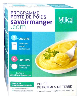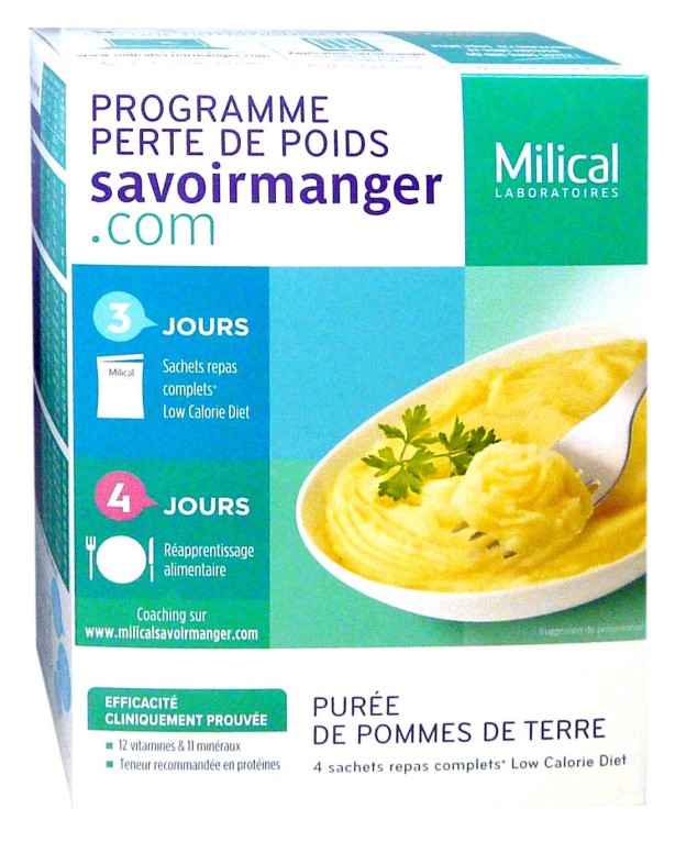 Le laboratoire MILICAL propose des compléments alimentaires, boissons, biscuits,… aux actions minceurs, drainantes,… élaborés par des nutritionnistes. La Purée de pommes de terre est à consommer dans le cadre du régime alimentaire « savoirmanger.com de MILICAL en se substituant au repas journalier. Ce repas est conseillé pour la perte du poids progressive et durable tout en prenant soin de sa santé. Riche en 11 vitamines, 12 minéraux et en protéines de haute qualité nutritionnelle, la purée est pauvre en matières grasses et en sucres et ne contient que 200 calories par repas pour des résultats efficaces sur le programme minceur. Avec sa saveur gourmande, la prise de ce repas sera un vrai plaisir pour atteindre son objectif ! Cette préparation en sachet est facile et rapide à préparer pour un repas savoureux ! En seulement quelques jours, la taille va s’affiner et les kilos superflus disparaitront.