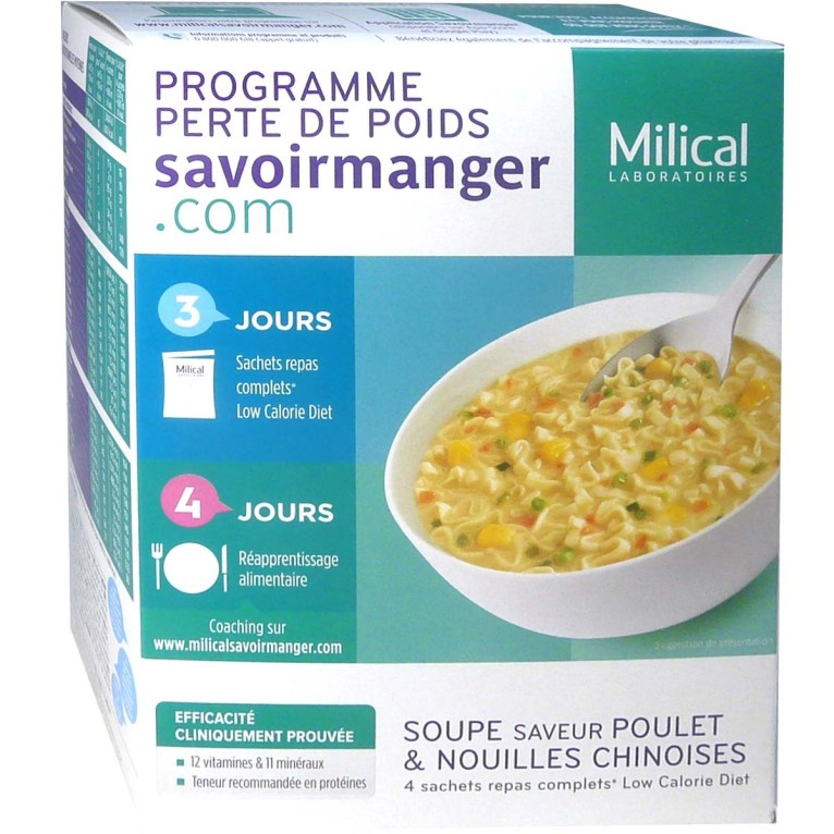 La Soupe saveur Poulet et Nouilles chinoises de MILICAL discount, une préparation en sachets dans votre parapharmacie en ligne à prix discount, pour le régime minceur de 7 jours avec le programme perte de poids Milical « savoirmanger.com », tout en se faisant plaisir !