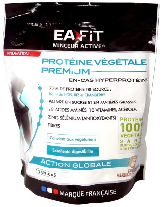 Le laboratoire EAFIT a conçu des compléments alimentaires à destination des femmes et des hommes sportifs pour améliorer les performances physiques conforme anti-dopage en partenariat avec des médecins du sport et nutritionnistes. Protéine Végétale Premium est un en-cas hyperprotéiné composé de vitamines (B, C et E), de fibres alimentaires d’origine végétale, d’un complexe synergisé anti-oxydant (sélénium, zinc, vitamines C et E), d’acérola (riche en vitamine C) et d’isolat de protéines de pois, riz et craberry qui contiennent une tri-source d’acides aminés essentiels. Grâce à ses nutriments et par sa teneur optimales en protéines, il va aider à mincir, favoriser la digestion et le bon fonctionnement du transit intestinal, renforcer les défenses naturelles de l’organisme, tout en gardant de la vitalité notamment lors de régime et de la masse musculaire, et protèger les cellules de l’organisme du stress oxydatif. La poudre à la délicieuse saveur vanille caramel sera un régal à consommer. Jour après jour, la perte de poids est visible, le tonus et la masse musculaire sont préservés. Convient aux personnes végétariennes, ou intolérantes au lactose. sans gluten, sans soja sans lactose, sans colorant, sans aspartame et sans conservateur.
