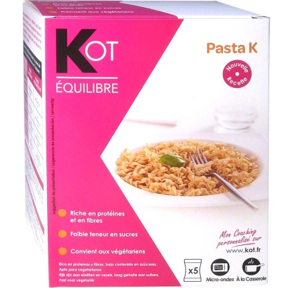 Le laboratoire KOT a été créé pour accompagner les personnes en surpoids dans leur démarche minceur en réconciliant nutrition équilibrée et plaisir. Ainsi la marque propose une méthode minceur incluant des produits gourmands : crêpes, pizzas, biscuits…, associés à des conseils nutritionnels personnalisés. La gamme des produits minceur salés KOT est constituée de délicieux produits diététiques, hyperprotéinés, hypocaloriques, appauvris en glucides et lipides, riches en fibres, aux multiples saveurs salées pour faciliter la perte de poids en toute gourmandise. PASTA’K Nature de KOT sont de délicieuses pâtes natures riches en protéines et en fibres, qui apportent seulement 100kcal par portions de 30g, 55% de matières grasses en moins que des pâtes vendues en rayon. Peut s’utiliser en phase intensive et en phase progressive du régime KOT.