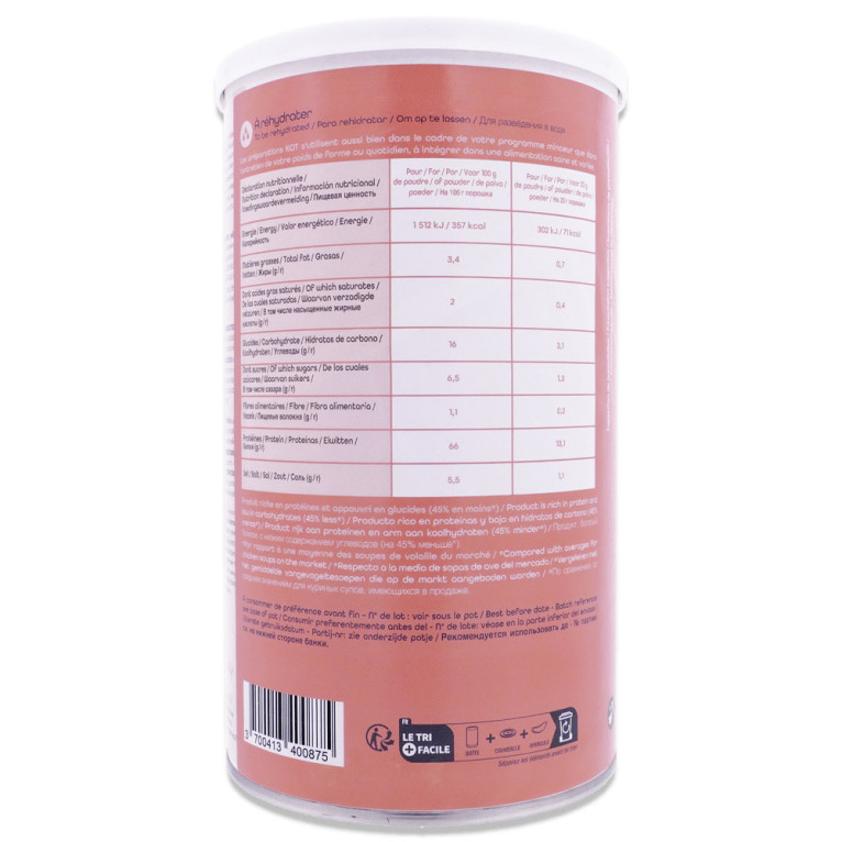 Le laboratoire KOT, reconnu pour son expertise en nutrition, propose une poudre à réhydrater qui se distingue par sa richesse en protéines. Ce velouté présente une faible teneur en sucres et en matières grasses, avec 45% de matières grasses en moins par rapport à la moyenne des soupes de volaille du marché, ce qui participe à une alimentation équilibrée. Profitez de ce délicieux velouté pour intégrer facilement des protéines dans votre quotidien et soutenir votre démarche minceur. N'attendez plus pour découvrir ce produit de qualité et ajouter une touche saine et gourmande à vos repas.