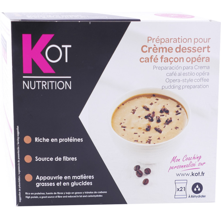 Le laboratoire KOT a été créé pour accompagner les personnes en surpoids dans leur démarche minceur en réconciliant nutrition équilibrée et plaisir. Ainsi la marque propose une méthode minceur incluant des produits gourmands : crêpes, pizzas, biscuits…, associés à des conseils nutritionnels personnalisés. La gamme des Crèmes minceur dessert KOT est constituée de crèmes hyperprotéinées, sources de fibres, hypocaloriques, appauvries en glucides et lipides, aux délicieuses saveurs pour faciliter la perte de poids en toute gourmandise. La Crème dessert Café Façon opéra et ses copeaux de chocolat de KOT avec sucres et édulcorants apporte seulement 78 calories par sachet de 22g, et est pauvre en matière grasses et en glucides par rapport à une autre crème dessert du marché. Peut s’utiliser en phase intensive ou en phase progressive du régime KOT.