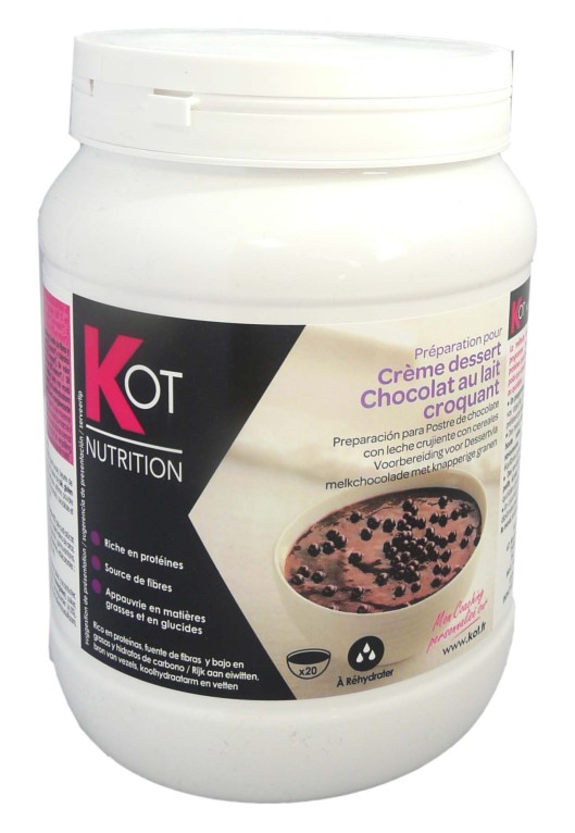 Le laboratoire KOT a été créé pour accompagner les personnes en surpoids dans leur démarche minceur en réconciliant nutrition équilibrée et plaisir. Ainsi la marque propose une méthode minceur incluant des produits gourmands : crêpes, pizzas, biscuits…, associés à des conseils nutritionnels personnalisés. La gamme des crèmes minceur dessert KOT est constituée de crèmes hyperprotéinées, sources de fibres, hypocaloriques, appauvries en glucides et lipides, aux délicieuses saveurs pour faciliter la perte de poids en toute gourmandise. La crème entremets chocolat au lait croquant de KOT, avec des céréales croustillantes, apporte seulement 73 calories par dosette, 0,7% de matière grasses et 80% de glucides en moins qu’une autre crème dessert. Peut s’utiliser en phase intensive ou en phase progressive du régime KOT.