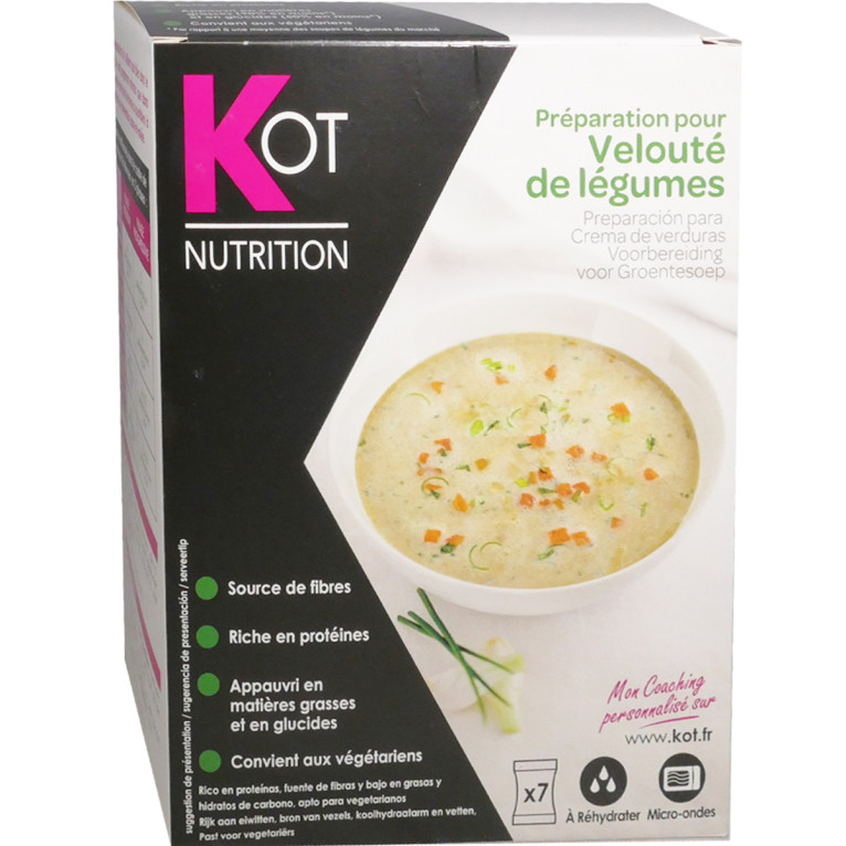 Le laboratoire KOT a été créé pour accompagner les personnes en surpoids dans leur démarche minceur en réconciliant nutrition équilibrée et plaisir. Ainsi la marque propose une méthode minceur incluant des produits gourmands : crêpes, pizzas, biscuits…, associés à des conseils nutritionnels personnalisés. La gamme des soupes minceur KOT est constituée de délicieux veloutés, soupes et potages hyperprotéinés, hypocaloriques, appauvris en glucides et lipides, riches en fibres, aux multiples saveurs pour faciliter la perte de poids en toute gourmandise. Le velouté de légumes de KOT, apporte seulement 82 Kcal par sachet de 25g, 90% de matières grasses en moins, et 50% de glucides en moins qu’une autre soupe aux légumes. Peut s’utiliser en phase intensive et en phase progressive du régime KOT.