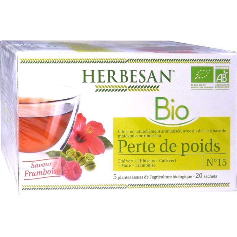 HERBESAN développe depuis plus de 40 ans des compléments alimentaires composés d’extraits de plante et d’actifs issus de la nature pour apporter une réponse naturelle à tous les besoins santé et bien-être. La gamme des INFUSIONS certifiées BIO est composée de produits spécialement conçus pour offrir un moment de plaisir et de bien-être nature. Infusion Bio Perte de poids d’HERBESAN est une infusion à base de plantes issues de l’agriculture biologique, sélectionnées pour leur capacité à favoriser la perte de poids et redonner de la vitalité à l’organisme : maté vert, thé vert, café vert et hibiscus. Cette infusion bien-être garantit également un véritable moment de plaisir grâce à la saveur de son arôme naturel de framboise.