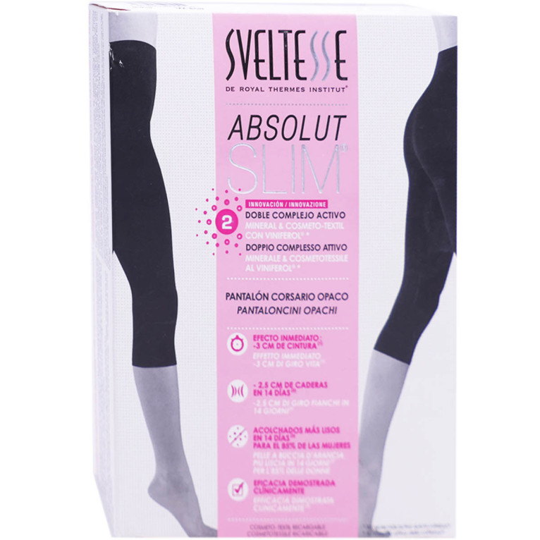 SVELTESSE Absolut Slim est la solution idéale pour affiner la silhouette, lisser la peau d’orange et raffermir la peau. Sous forme d’un Panty à enfiler, invisible sous les vêtements, SVELTESSE Absolut Slim Corsaire gaine immédiatement la silhouette. Mais il offre également une action amincissante renforcée grâce à ses fibres «Cosmeto-Textile» qui assurent un micro-massage et une diffusion permanente d’actifs amincissants microencapsulés à base de minéraux et viniférol, par principe de chrono-libération. 30 fois plus efficace que la caféine, le viniférol éliminera les tissus adipeux responsable de la cellulite. Souple et doux au toucher, Sveltesse Absolut Slim Corsaire s’entretient très facilement et sèche rapidement. Il est rechargeable tous les trois lavages grâce aux recharges Actifs Minceur que l’on ajoute à la dernière eau de rinçage. Résultat : instantanément la taille diminue de 3cm et les hanches de 2,5cm. Après plusieurs semaines de port quotidien la peau est plus ferme, plus lisse et la silhouette visiblement affinée.