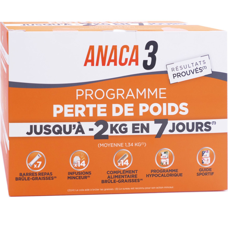 ANACA3 programme Perte de poids discount, le programme complet composé de barre repas, d’infusion associé à un complément alimentaire pour contribuer à brûler les graisses dans votre parapharmacie en ligne à prix discount. Jusqu'à 2kg en 7 jours.