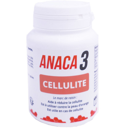 ANACA3 Cellulite est un complément alimentaire conditionné sous forme de gélules formulé à partir d'extraits de plantes (marc de raisin, curcuma), de la vitamine C, du zinc, du chrome et du cuivre.