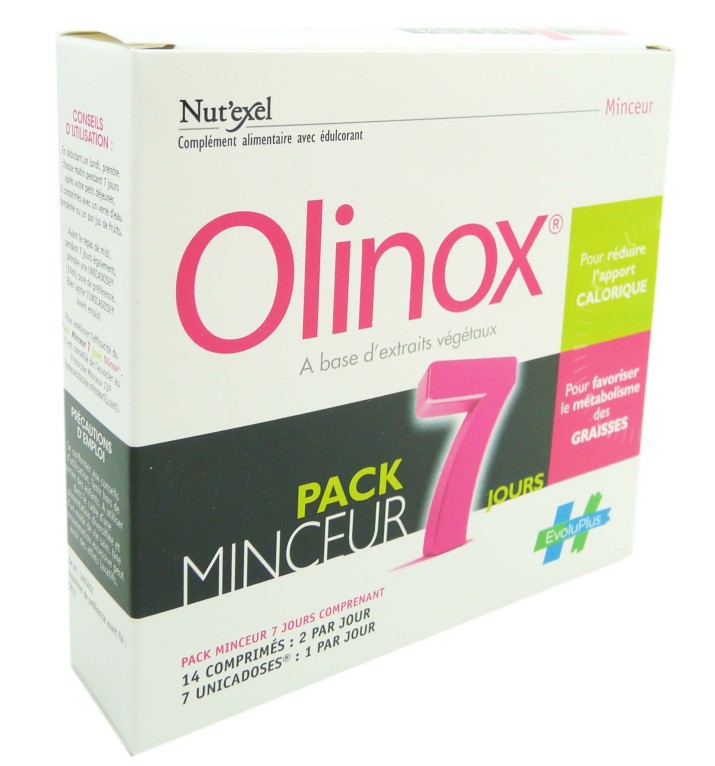 Le laboratoire EVOLUPLUS/EVOLUPHARM conçoit des produits d’hygiène, de bien être, de soins et des médicaments. Ce complément alimentaire avec édulcorant draine l’organisme pour accélérer l’élimination de l’eau en excès et favoriser le bon fonctionnement urinaire, et brûle les graisses et les calories assimilées par l’alimentation grâce aux extraits végétaux composés de nopal, d’extrait de piment titré à 2% en capsaïcine, d’extrait de fucus, de baies de goji, de guarana et de fenouil doux.En 7 jours, la taille s’affine et les kilos superflus disparaissent. Nut’Exel Olinox Pack Minceur 7 jours a été fabriqué en France et composé d’après les recommandations du Protocole Minceur 7J® avec une logique telle que « si la dépense énergétique est supérieure à l'apport calorique, il y a amincissement ». Ce complément alimentaire a été testé sous contrôle d'huissier en association avec le protocole minceur 7J®