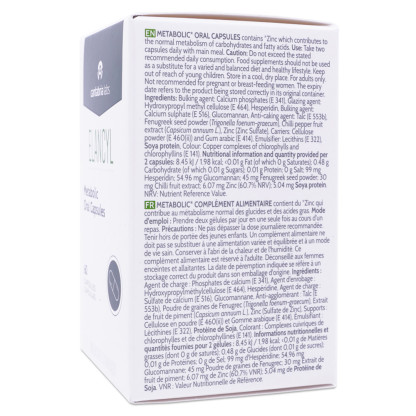 Informations nutritionnelles et quantités fournies pour 2 gélules : 8,45 kj/1,98 kcal ; <0,01 g de matières grasses dont 0 g de saturés) ; 0,48g de glucides (dont 0,01 g de sucres) ; 0,01 g de protéines : 0g de sel ; 99 mg d'hespéridine ; 54,96 mg glucomannane ; 45 mg poudre de graines de fenugrec 30mg extrait de fruit de piment ; 6,07 mg de zinc (60,7% VNR) ; 5,04 mg de PROTEINE DE SOJA. VNR : Valeur Nutritionnelle de Référence